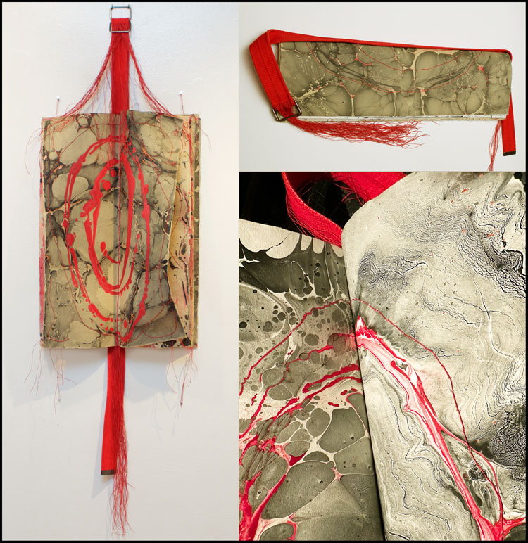 Single signature, link stitch, acrylic paper marbling, linen thread, found red nylon belt with metal buckle rings, #1/1