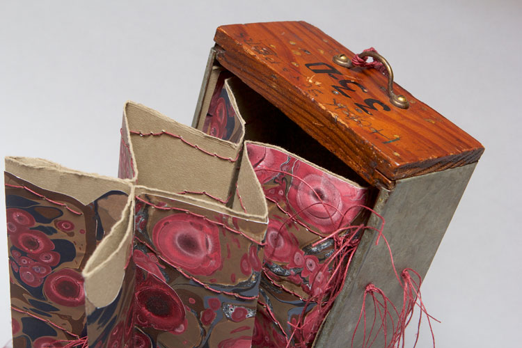 Layered Concertina bound into found metal & wood tool box drawer, Tiger Eye (aka Sunburst or Eyes of Ra) acrylic paper marbling on Masa paper, Hahnemuhle Bugra paper, linen thread