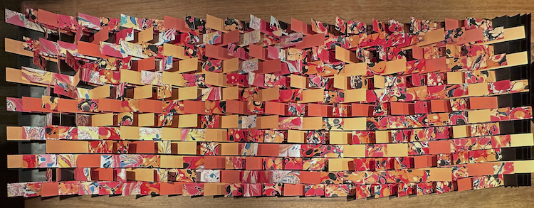 The Descent may seem a strange title for this artist’s book. Most folks see marbling as pure, abstract color and design; it’s just beautiful. They imagine it’s meditative to create, and that’s where they think the story ends. However, marbling is a turbulent art technique with chemistry and liquid dynamics at its core. The surface of the marbling vat can be seen as a street fight with pushing and shoving. Some colors are bullies; others just sink away. There’s a constant balance that must be maintained for optimal results.
