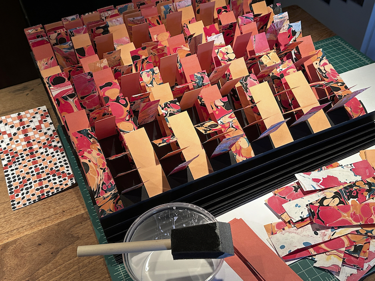 The flags in this artist’s book are 2-sided marbling with the forward flags designed with a stone pattern and the reverse of those flags printed on dying marbling vats. The staircase of flags propels the story downward with the broken, jagged colors drifting with remnants of stones towards the end.